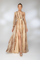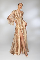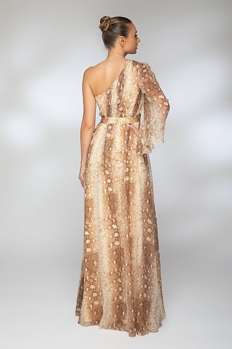 Elegant long animalier dress in veil with slit, featuring a single wide sleeve.