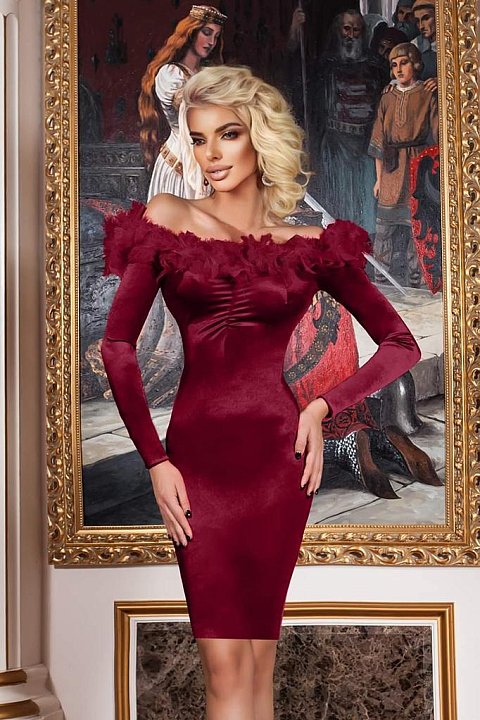 Questo abito rosso con scollo a barca e dettagli in piume ha un fascino regale e audace, perfetto per eventi di gala o serate di grande eleganza. La silhouette aderente e il tessuto liscio esaltano la figura in modo elegante, mentre le piume sulla scollatura aggiungono un tocco drammatico e raffinato.