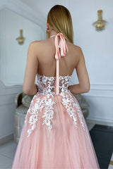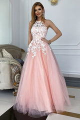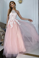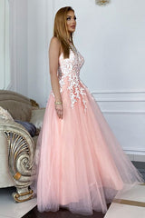 Peach pink evening dress with white lace embroidered bodice and bow on the back. The vaporous tulle skirt adds a romantic touch, perfect for elegant events.