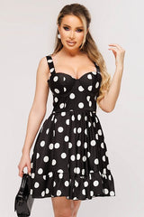Questo mini dress nero con stampa a pois bianchi è l'essenza dello stile retrò rivisitato in chiave moderna. Il design a bustier con coppe strutturate valorizza il décolleté, mentre la gonna ampia con balza crea movimento e femminilità. Realizzato in tessuto leggero e morbido, è perfetto per giornate estive, aperitivi o eventi casual chic. Da abbinare a sandali nude o décolleté per un look irresistibile.