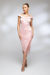 Elegant satin sheath dress with dropped shoulders and fringes on the slit.