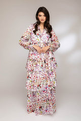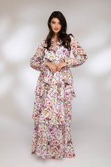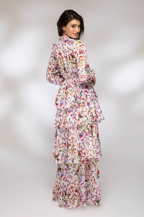 Long voile dress is the perfect choice for those who want an elegant and feminine look. The light and flowing fabric, embellished with a lively floral print, gives a touch of romance and sophistication. The flounces add volume and movement, creating a charming and sophisticated effect. The design is completed by a delicate collar and slightly flared long sleeves.