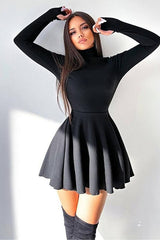 Elegante e versatile, questo abito corto nero a collo alto è la scelta perfetta per ogni occasione. Confezionato in tessuto elasticizzato, garantisce una vestibilità aderente e comoda. Le maniche lunghe con dettagli ditali aggiungono un tocco moderno, rendendolo perfetto per look casual o più raffinati. Indossalo con stivali alti per un outfit chic e contemporaneo. Perfetto per la stagione fredda, combina stile e praticità in un unico capo.