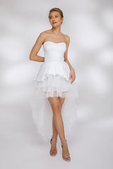Grazioso abito bianco corto davanti e lungo dietro, senza spalline, con gonna doppio strato in tulle con balze.