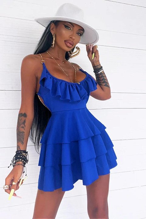 Casual and semi-elegant short dress with ruffles and crossed chain straps on the open back.
