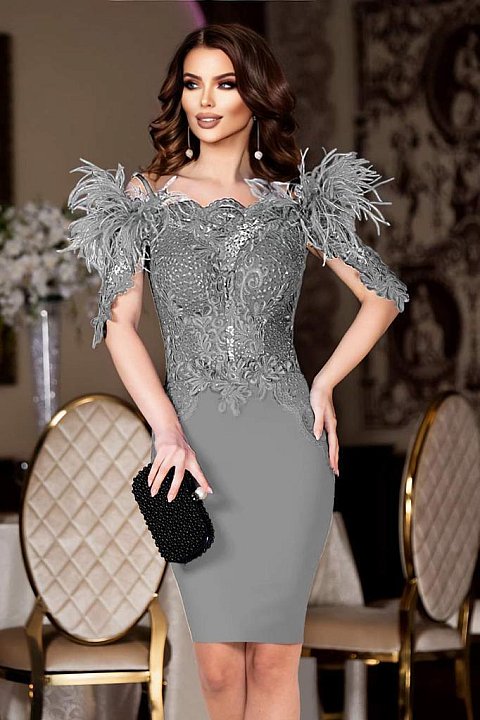 Elegant sheath dress with inserts and feathers.