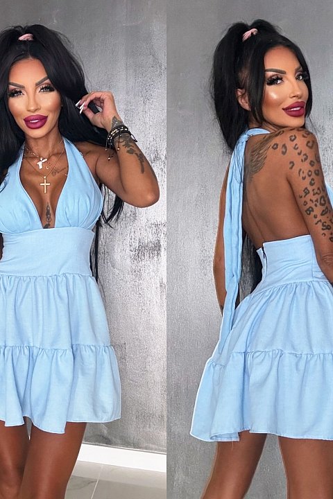 Short dress with ruffles and deep neckline, halterneck and open back.