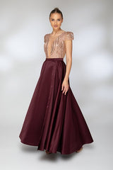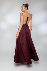 Elegant long dress in taffeta with voluminous skirt, sequins on the bustier and zip on the tulle back.