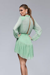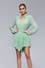 Mint green short dress, perfect for special events and elegant evenings. Crafted from a lightweight fabric and embellished with sparkling details. Crafted from a lightweight fabric and embellished with sparkling details. The long transparent sleeves add a touch of elegance, while the waist belt with a jewel buckle accentuates the silhouette.