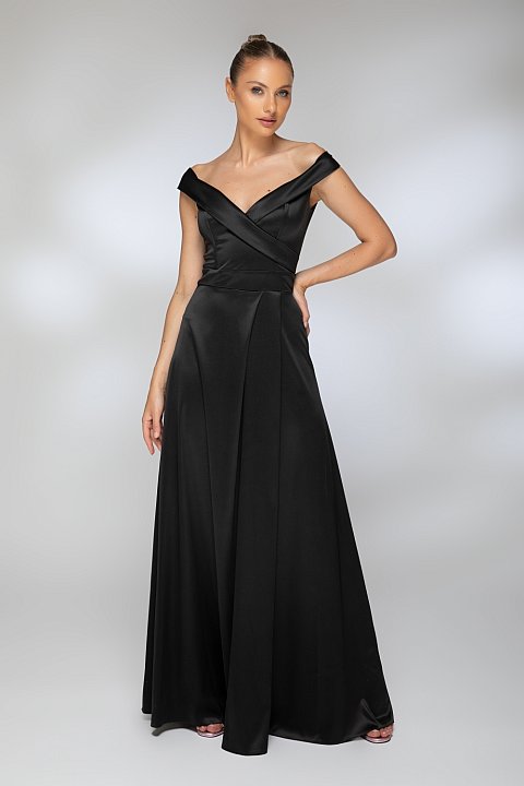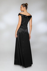 Elegant black long dress with slit. Bodice with dropped shoulders and crossed lapel collar. Perfect as an evening dress and also suitable for special occasions.