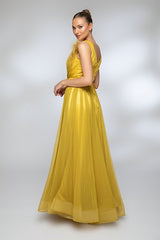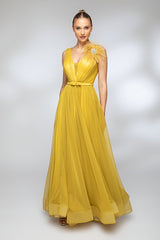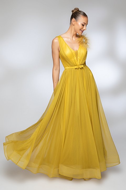 Elegant long dress with wide skirt gathered at the waist, deep neckline and decorative brooch with feathers.