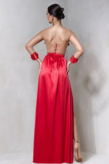 Abito lungo con scollo a cuore e dettagli floreali in rilievo sul corpetto trasparente. Maniche lunghe in tulle, gonna satinata con spacco laterale e inserti ricamati per un look elegante e romantico.