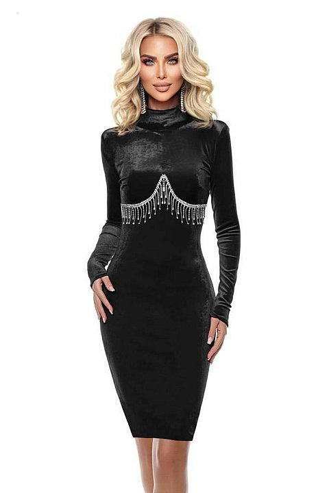 Tubino dolcevita elegante a maniche lunghe con dettaglio catena gioiello sul bustier.