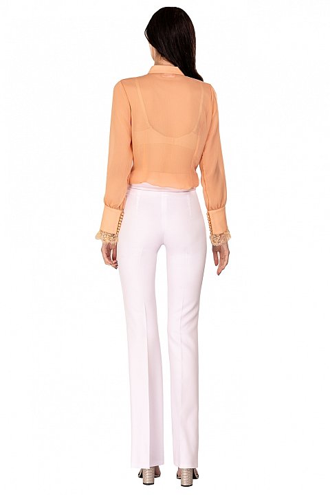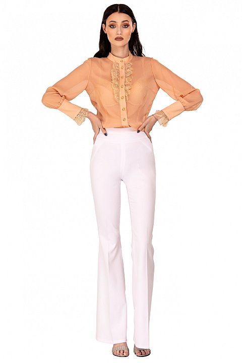 Elegant veil shirt with mandarin collar and embroidered ruffles.