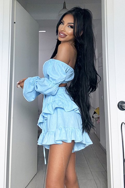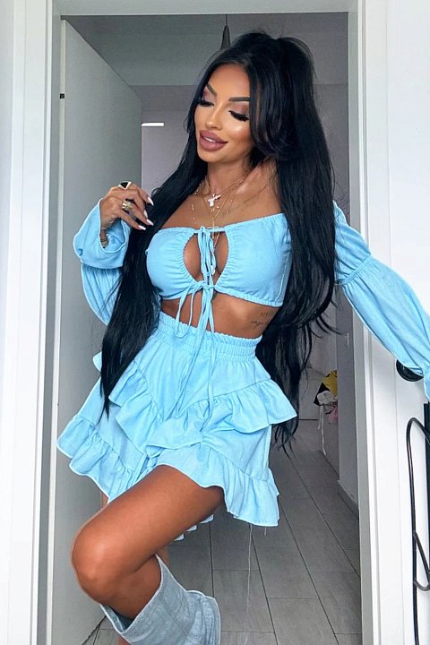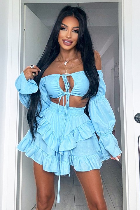 Casual 2-piece linen set consisting of long-sleeved bikini top and high-waisted ruffle shorts.