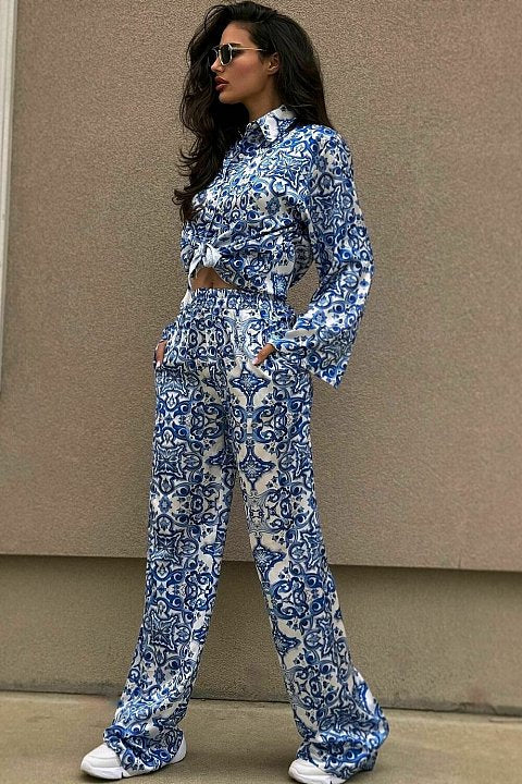 Completo coordinato dalle tonalità ispirate alla ceramica. Il set presenta una camicia con maniche ampie e un nodo in vita. I pantaloni ampi con tasche e vita elasticizzata garantiscono comfort e stile, perfetti per un look chic ma rilassato.