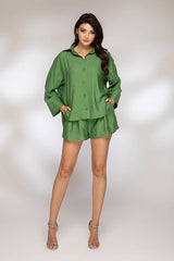 Completo casual 2 pezzi in lino composto da camicia oversize con bottoni foderati e pantaloncini dal taglio ampio.