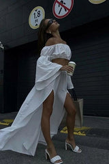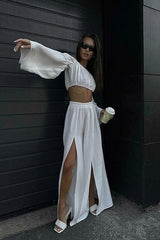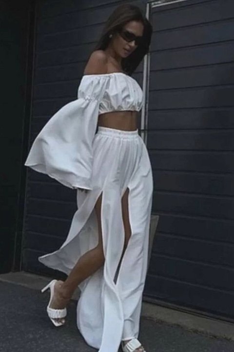 Completo estivo composto da un top corto con maniche a campana e pantaloni ampi con spacchi laterali.