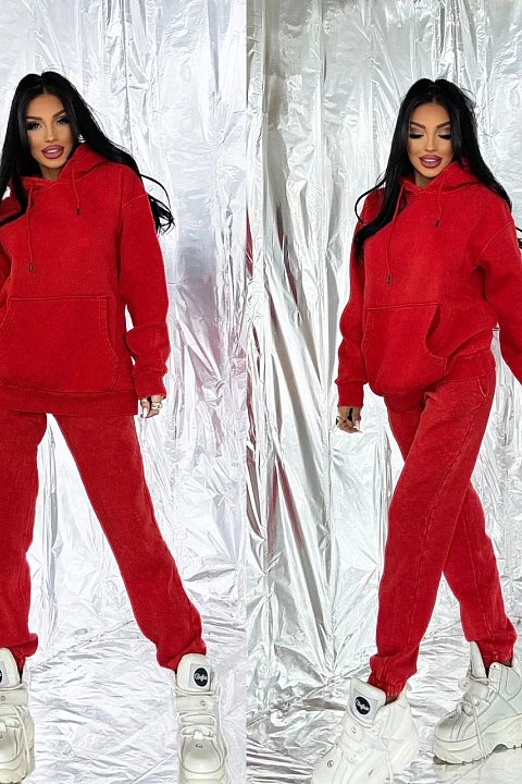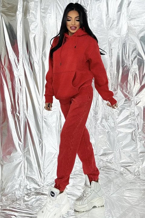 Dai energia al tuo stile con il Completo Felpa e Jogger Effetto Acid Wash in rosso intenso. La felpa oversize con cappuccio e tasca a marsupio si abbina perfettamente ai joggers dal fit rilassato, offrendo comfort e tendenza in un solo capo. Realizzato in cotone morbido, con effetto stone wash per un tocco vintage e originale. Ideale per il tempo libero o per un outfit streetwear che non passa inosservato.