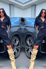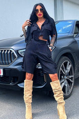 Black Streetwear Outfit with Crop Shirt and Bermuda Shorts Express your style with this elegant streetwear set in black, perfect for a casual and trendy look. Crafted from lightweight and breathable fabric, this set is ideal for spring and summer days. The set consists of a cropped shirt with front pockets, featuring a button closure, and Bermuda pants with an elastic waist, offering a comfortable and regular fit. The knee-length pants give a modern touch, making this outfit versatile for different occasions. Available in sizes XS, S, M and L, this set is a must-have for those who want an urban and sophisticated look. Main features: Composition: Lightweight and breathable fabric Color: Black Style: Streetwear, casual Details: Crop shirt with front pockets and Bermuda shorts Closure: Button-down shirt, elasticated waist trousers Fit: Regular Pants length: Knee-length Occasion: Perfect for casual and trendy looks Season: Spring/Summer Available sizes: XS, S, M, L