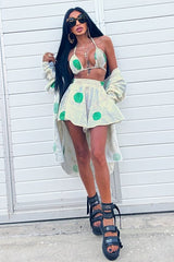 Casual 3-piece polka dot set consisting of a bikini, cover-up and wide-leg shorts.