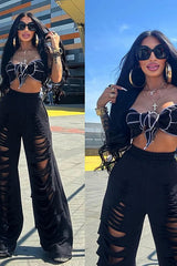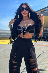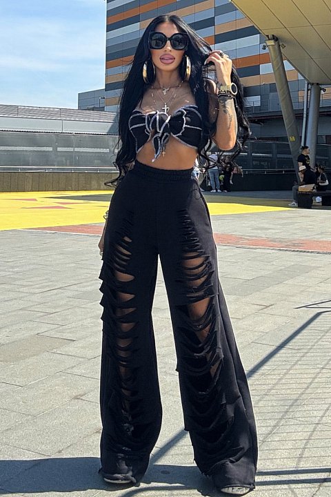 Completo sportivo 2 pezzi composto da top bikini a fascia con finiture a contrasto e pantaloni larghi a vita alta con intagli.