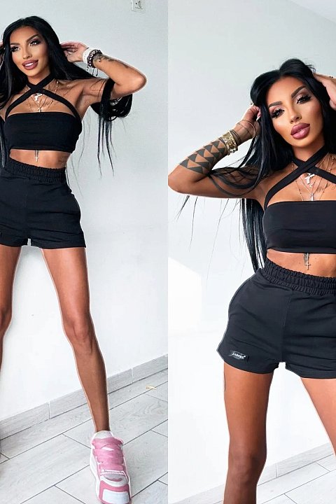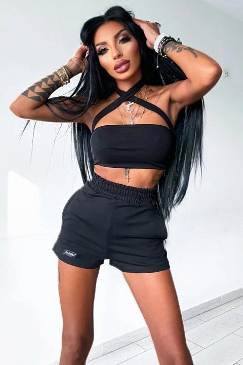 2-piece sports set consisting of a bandeau top with cross-neck fastening and high-waisted shorts.