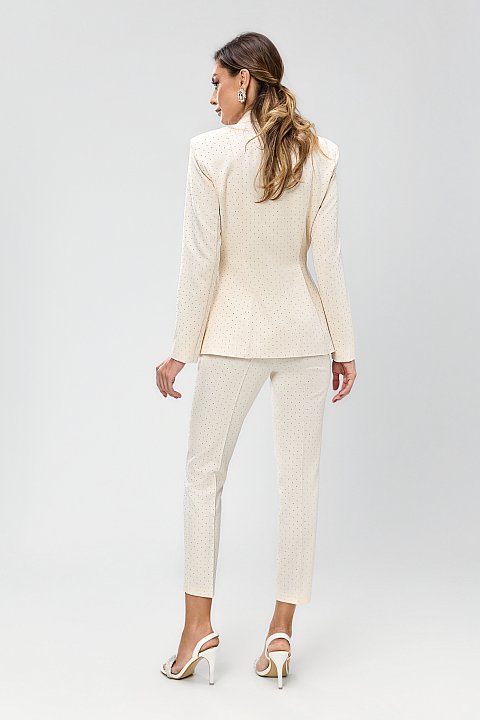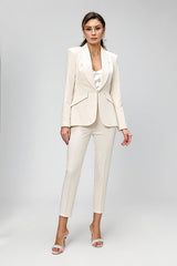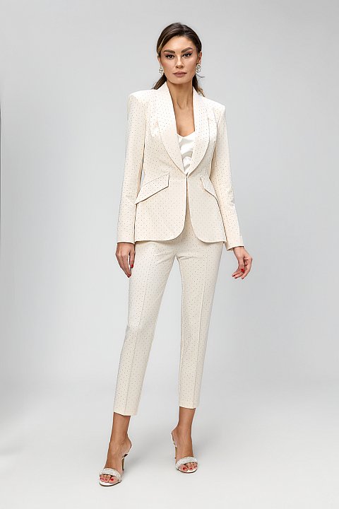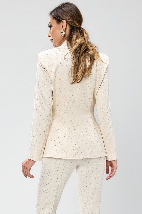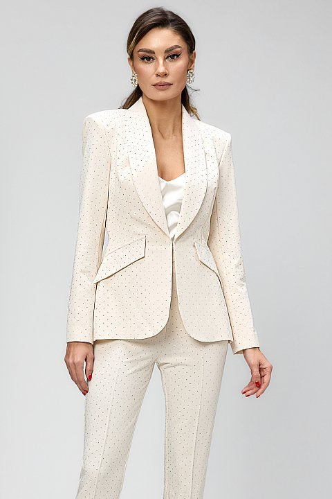 Questo tailleur avorio con micro strass è la scelta ideale per un’eleganza raffinata e senza tempo. Il blazer dal taglio sartoriale esalta la silhouette, mentre i pantaloni slim fit completano un look impeccabile. Perfetto per eventi formali, cerimonie o occasioni speciali. Crea il tuo stile unico con un completo che unisce classe e modernità!