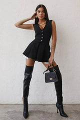 Completo smanicato con bottoni, scollo profondo e gonna plissettata, ideale per un look elegante e sensuale.