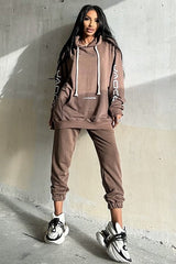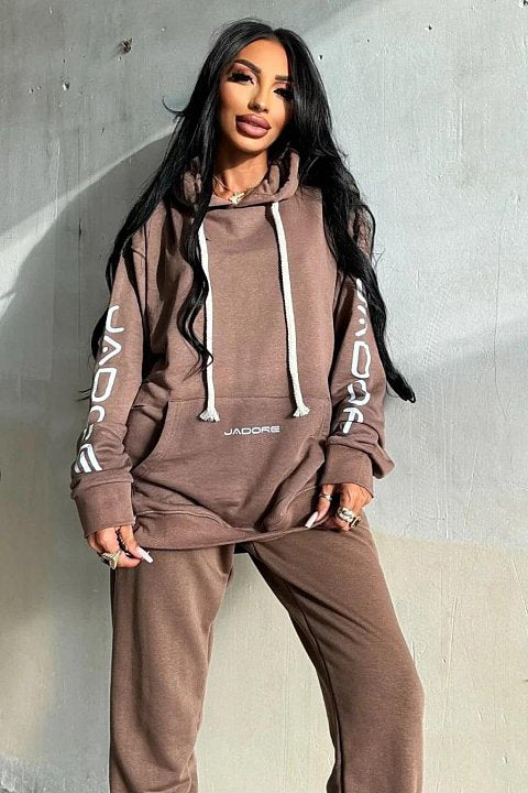 Scopri la tuta sportiva oversize da donna in morbido tessuto color caffè firmata Jadore. Il set include una comoda felpa con cappuccio, dettagli con logo sulle maniche e tasca frontale per uno stile casual e contemporaneo. Pantaloni con polsini elasticizzati per un comfort ottimale, perfetti per il tempo libero o per uno stile urban alla moda. Aggiungi al tuo guardaroba un tocco di comfort e stile con questa tuta versatile, ideale per le giornate fresche o gli allenamenti all'aperto.