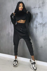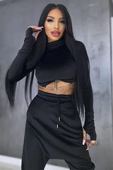 Completo in morbido velluto nero, perfetto per un look casual ma di tendenza. Il top crop a maniche lunghe con colletto alto offre un tocco moderno e seducente, mettendo in evidenza la silhouette con un elegante dettaglio a catena sulla vita. I pantaloni larghi con coulisse regolabile garantiscono comfort e versatilità, rendendolo ideale per l'uso quotidiano o per occasioni speciali.