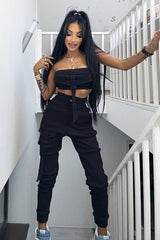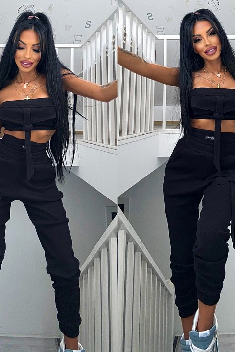 2-piece sporty outfit consisting of a bandeau top and comfy high-waisted trousers, with hanging straps detail.