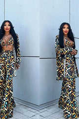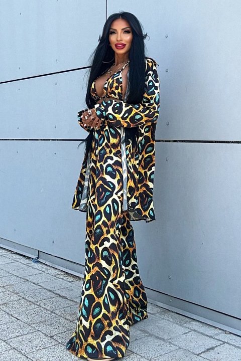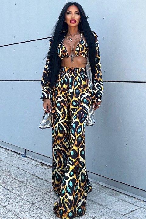 The set includes a deep-neck crop top, wide-leg trousers and a matching lightweight jacket, creating a perfect outfit for summer evenings or special events. Crafted with an animal print that mixes warm shades of yellow, brown and black, it is ideal for a bold and sensual look.