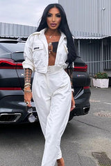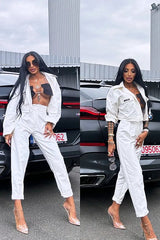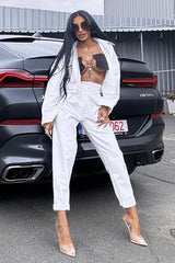 White three-piece suit for women, consisting of a cropped jacket, high-waisted trousers and a minimalist top. Perfect for a bold and sophisticated look,