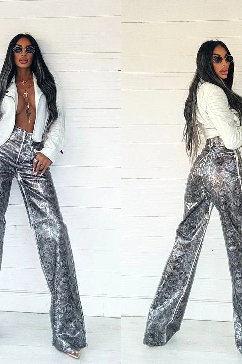 Scopri i nostri audaci jeans a zampa con stampa pitonata e finitura lucida, perfetti per chi ama osare e distinguersi. Realizzati con materiali di alta qualità, questi jeans garantiscono un fit confortevole e una silhouette slanciata. Ideali per creare look glamour ed eleganti, abbinati a giacche in pelle o top aderenti per serate speciali. Scegli questi pantaloni per un tocco selvaggio e sofisticato al tuo guardaroba.