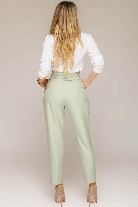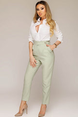 Dona un tocco chic e primaverile al tuo guardaroba con questi pantaloni verde menta a vita alta. Il taglio affusolato con piega centrale e chiusura a bottone valorizza la silhouette con eleganza, mentre la tonalità tenue e raffinata si adatta perfettamente a look formali o casual chic. Ideali con camicie bianche e blazer, per uno stile professionale ma moderno. Un capo must-have per la donna che ama distinguersi con classe.