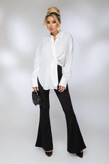 Pantaloni neri a zampa d'elefante realizzati in un tessuto elasticizzato che esalta la silhouette. Perfetti per slanciare la figura e aggiungere un tocco di eleganza al tuo guardaroba quotidiano. Ideali per essere abbinati a camicie o bluse, questi pantaloni sono una scelta vincente per chi cerca uno stile sofisticato e confortevole.