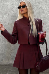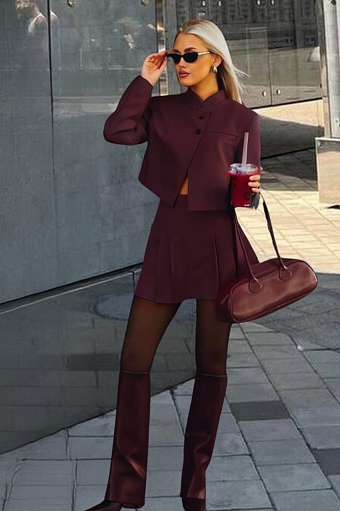 Scopri l'eleganza senza tempo del nostro completo da donna, perfetto per ogni occasione. Il blazer corto con chiusura a bottoni tono su tono offre un design pulito e sofisticato, mentre la gonna a pieghe aggiunge un tocco di femminilità e movimento. Realizzato in tessuto di alta qualità, questo ensemble garantisce comfort e durata. Il colore burgundy intenso lo rende versatile e adatto a combinazioni multiple. Ideale per eventi formali o un look da ufficio chic. Eleva il tuo guardaroba con questo must-have della stagione!