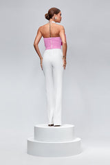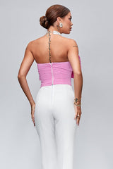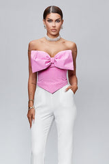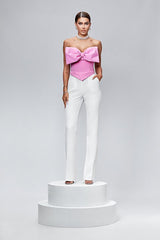 Top a righe senza spalline, accessoriato con fiocco e strass, orlo asimmetrico.