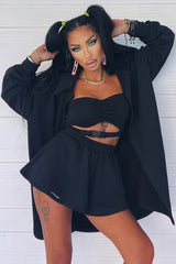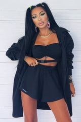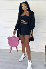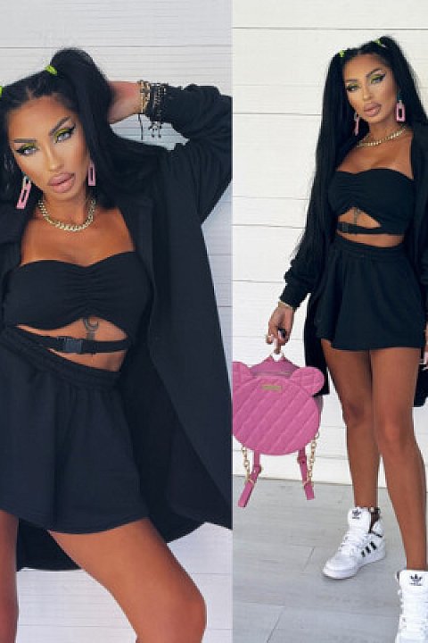 Completo sportivo composto da top a fascia con cut out e fibbia ad incastro a contrasto, felpa lunga e aperta con colletto e pantaloncini con fascia elastica arricciata.