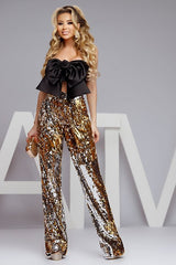 El pantalón de lentejuelas es un pantalón de cintura alta. El pantalón es de vuelo, con tonos plateados y dorados.