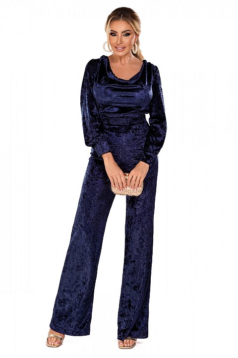Jumpsuit elegante in velluto con schiena scoperta accessoriata con catena e pantaloni a gamba dritta.