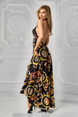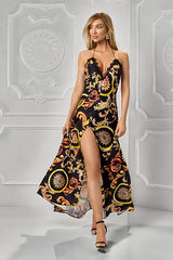 Lasciati conquistare dal fascino opulento di questo abito lungo in satin con stampa barocca. Il design con spalline sottili e scollo profondo in pizzo nero esalta la silhouette, mentre il maxi spacco frontale dona sensualità e movimento. La fantasia dorata e floreale su base nera richiama lo stile luxury italiano, perfetto per cerimonie, serate glamour o eventi importanti. Da abbinare a sandali alti e orecchini dorati per un look indimenticabile.