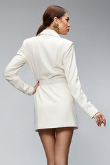 Abito blazer doppiopetto con tasche, bottoni oro a specchio e cintura bucherellata in vita con fibbia.