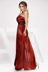 L'abito lungo in crepe bordeaux è un elegante abito monospalla. L'abito lungo è vaporoso, con lame in materiale che ti regala raffinatezza e sensualità.