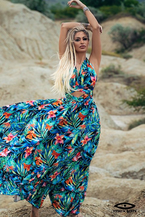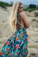 Abito lungo casual in fantasia floreale con balza sull'orlo, corpetto allacciato al collo, schiena scoperta, cut out sul ventre.