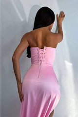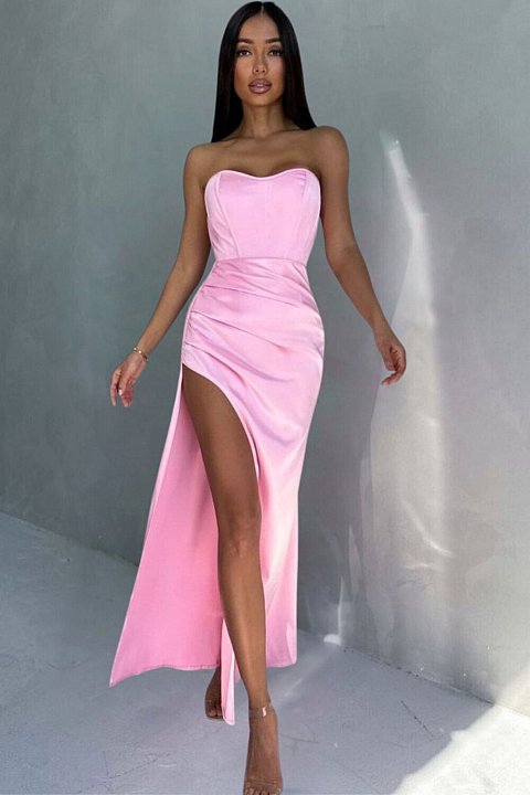 Abito lungo da sera rosa con spacco laterale. Realizzato in tessuto satinato, questo vestito senza spalline valorizza la figura grazie al corpetto strutturato e alla gonna drappeggiata che scivola dolcemente sui fianchi.