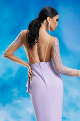 Abito lungo elegante con spacco, schiena scoperta e bustier trasparente con rifiniture in paillettes.