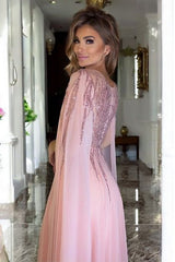 Lasciati incantare da questo abito lungo rosa cipria, perfetto per cerimonie ed eventi esclusivi. Il corpetto è finemente decorato con ricami brillanti tono su tono che donano luminosità e raffinatezza. La vera protagonista è la mantella in chiffon leggera e fluida, cucita sulle spalle, che aggiunge un tocco etereo e principesco. La gonna ampia e scivolata slancia la figura, rendendolo ideale per madrine, invitate e momenti indimenticabili. Da abbinare a clutch gioiello e sandali eleganti.