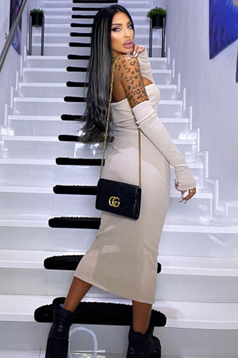 Abito sportivo, fantasia tre quarti, colore beige. Scollo con cerniera e maniche lunghe.